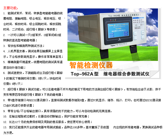 产品简介TOP-962A继电器综合参数测试仪